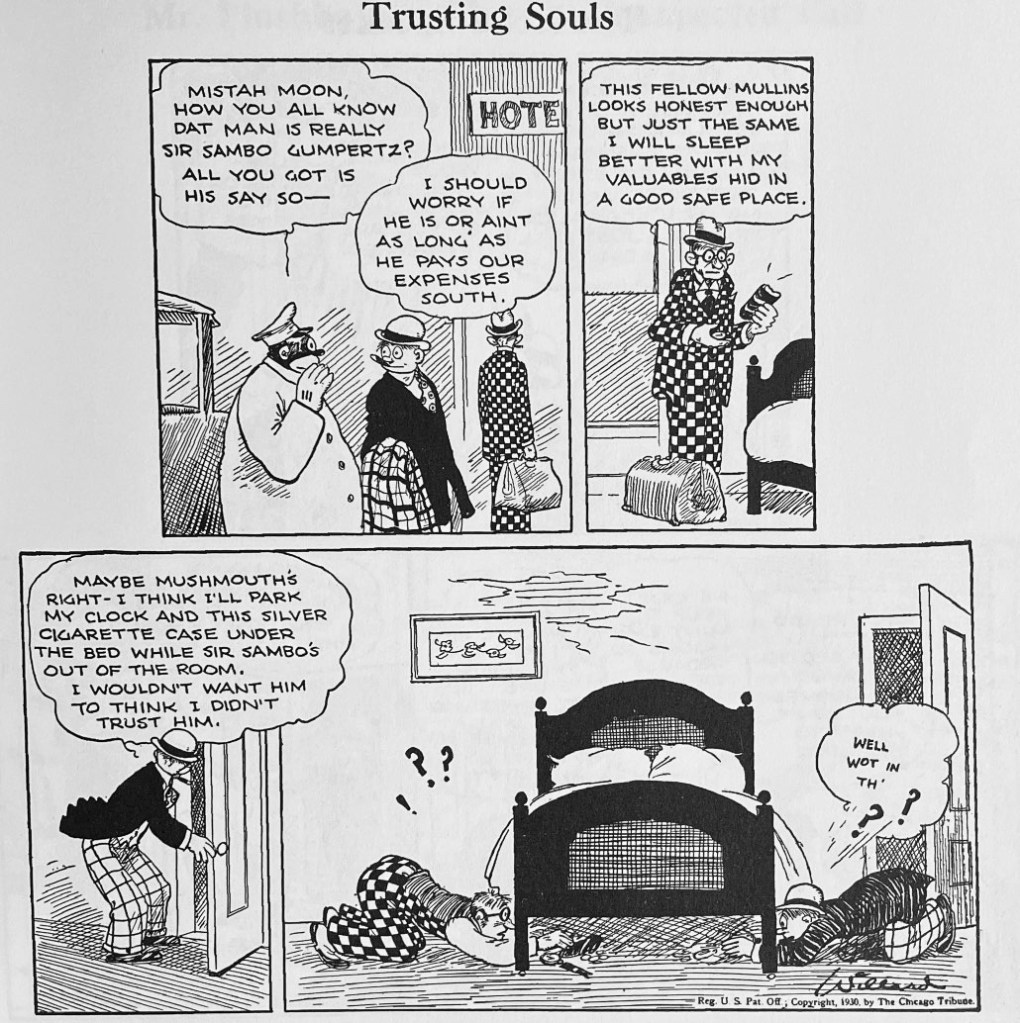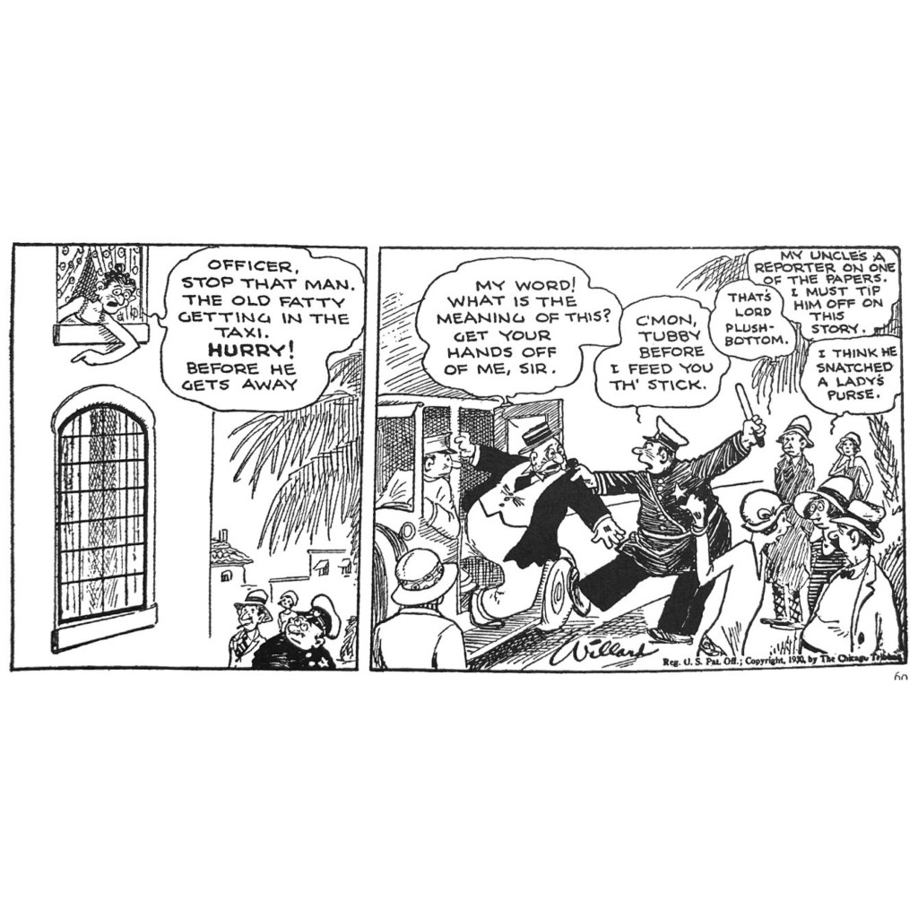 Willard had a deft sense of comic strip cadence, with a great ability to advance an episode yet tell a complete story in just three or four daily frames. In the sequence above, part of a 1931 road trip to Florida, Emmy is trying to get Lord Plushbottom’s attention. The usual sit-com tropes ensue: miscommunication, misapprehension, confusion. Premise, activation and gag all take place within three panels.